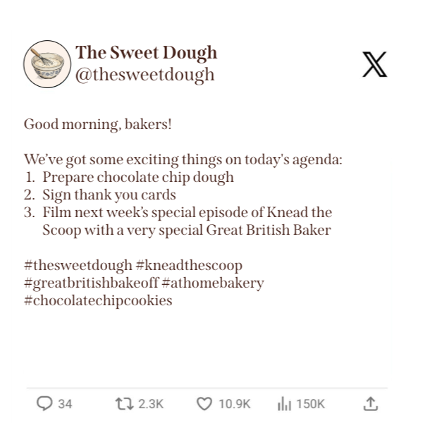 Rationale: This post is meant to get our audience excited for the next episode of Knead the Scoop. By using emojis and casual language, The Sweet Dough is trying to connect easily with everyone on X.